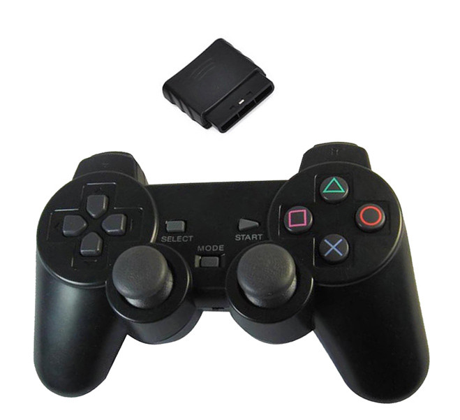 دسته بازی بیسیم شوک دار مخصوص سونی پلی استیشن 2 تک نفره یک دسته بیسیم با قابلیت اتصال به کنسول بازی شما از طریق وایرلس است تا دیگر در لحظات هیجان انگیز بازی سیم های دسته بازی جلو دست و پای شما را نگیرند.به همراه این دسته یک عدد دانگل وایرلس وجود دارد که شما آن را به کنسول وصل و با قزار دادن دو عدد باتری در داخل دسته بازی و روشن کردن آن اتصال برقرار میشود و میتوانید بازی کنید.