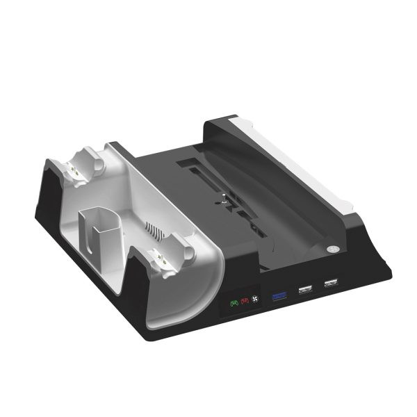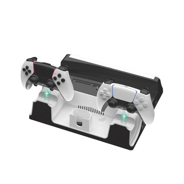 این استند نه تنها کنترلرهای PS5 را همزمان و سریع شارژ میکند، بلکه با داشتن ۱۴ جای دیسک، نگهدارنده دو هدست، سه پورت USB و دو حالت شارژ، تمام تجهیزات گیمینگ را در یک نقطه جمع میکند.